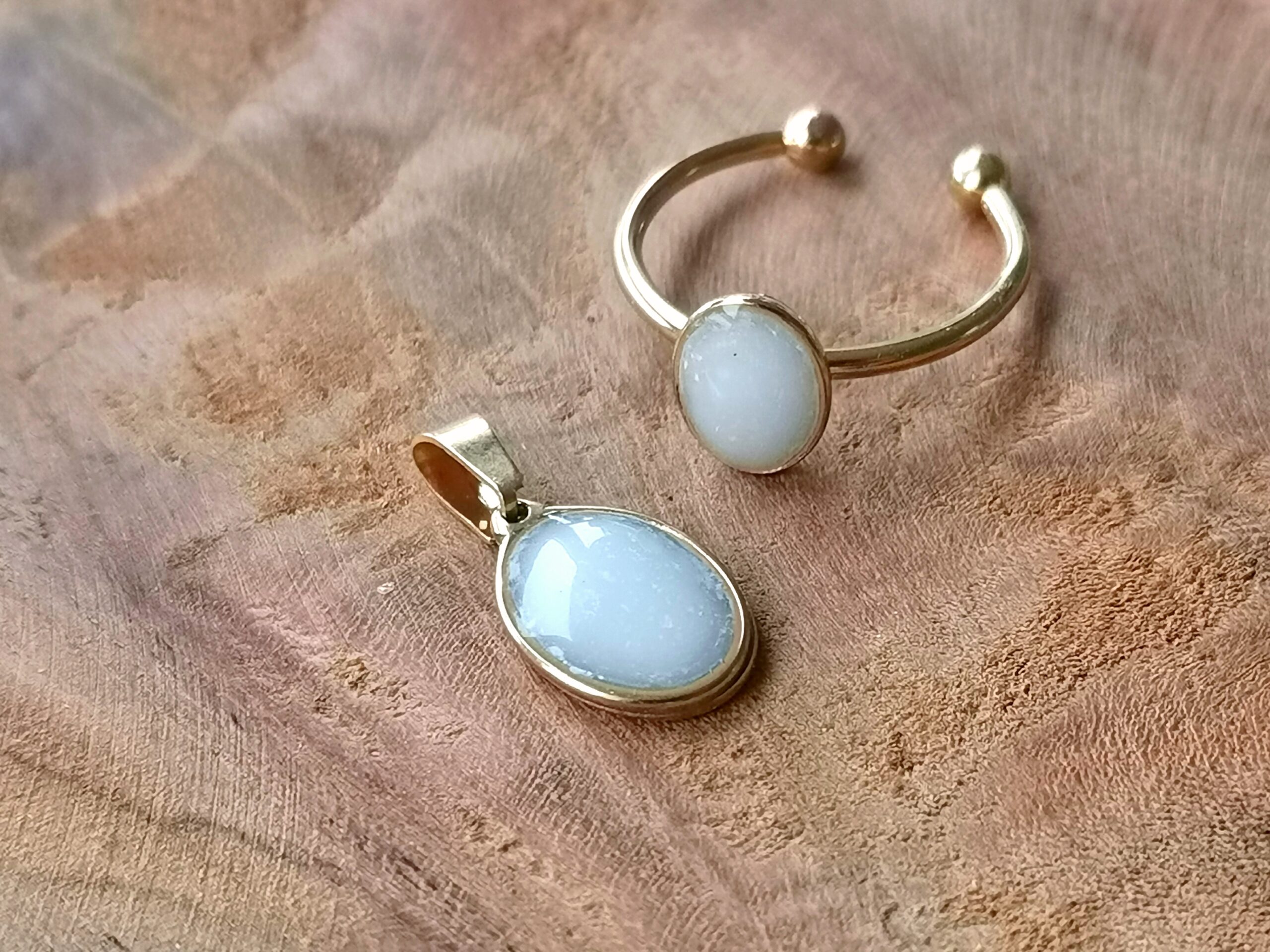 La pierre de lait est faite avec de la résine et mesure environ 0,09 cm x 0,07 cm pour la bague et 1,2 cm x 0.9 cm pour le pendentif.