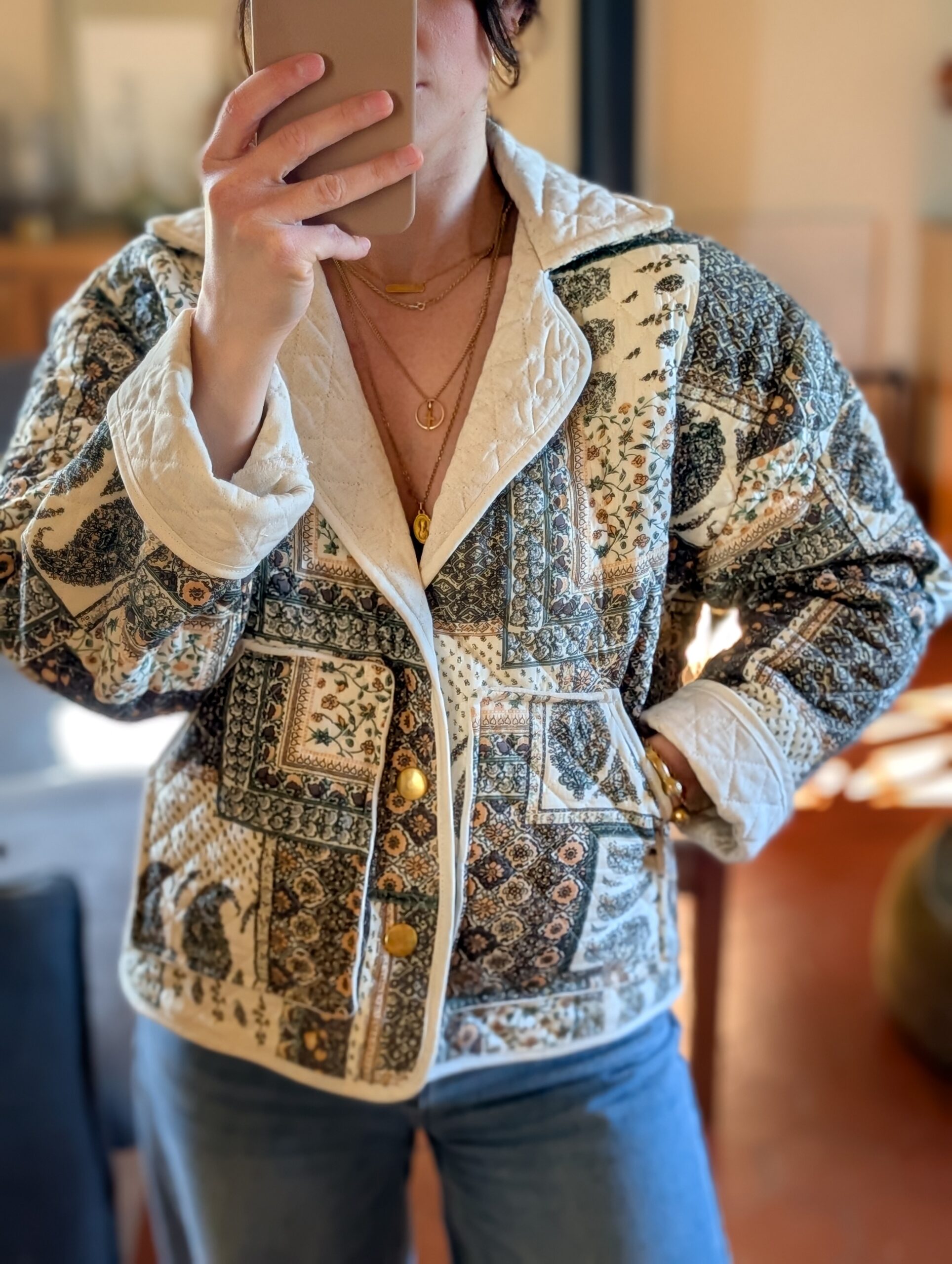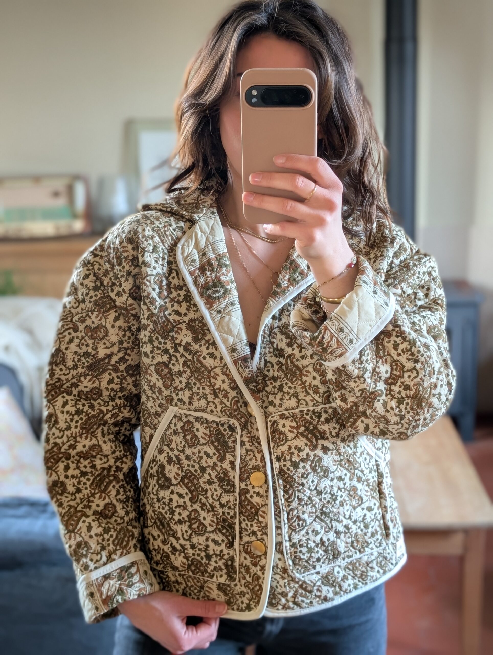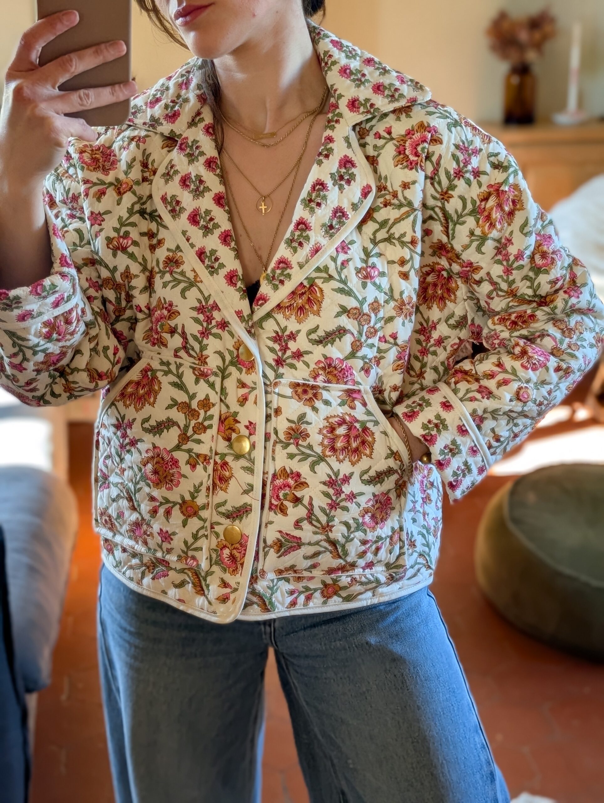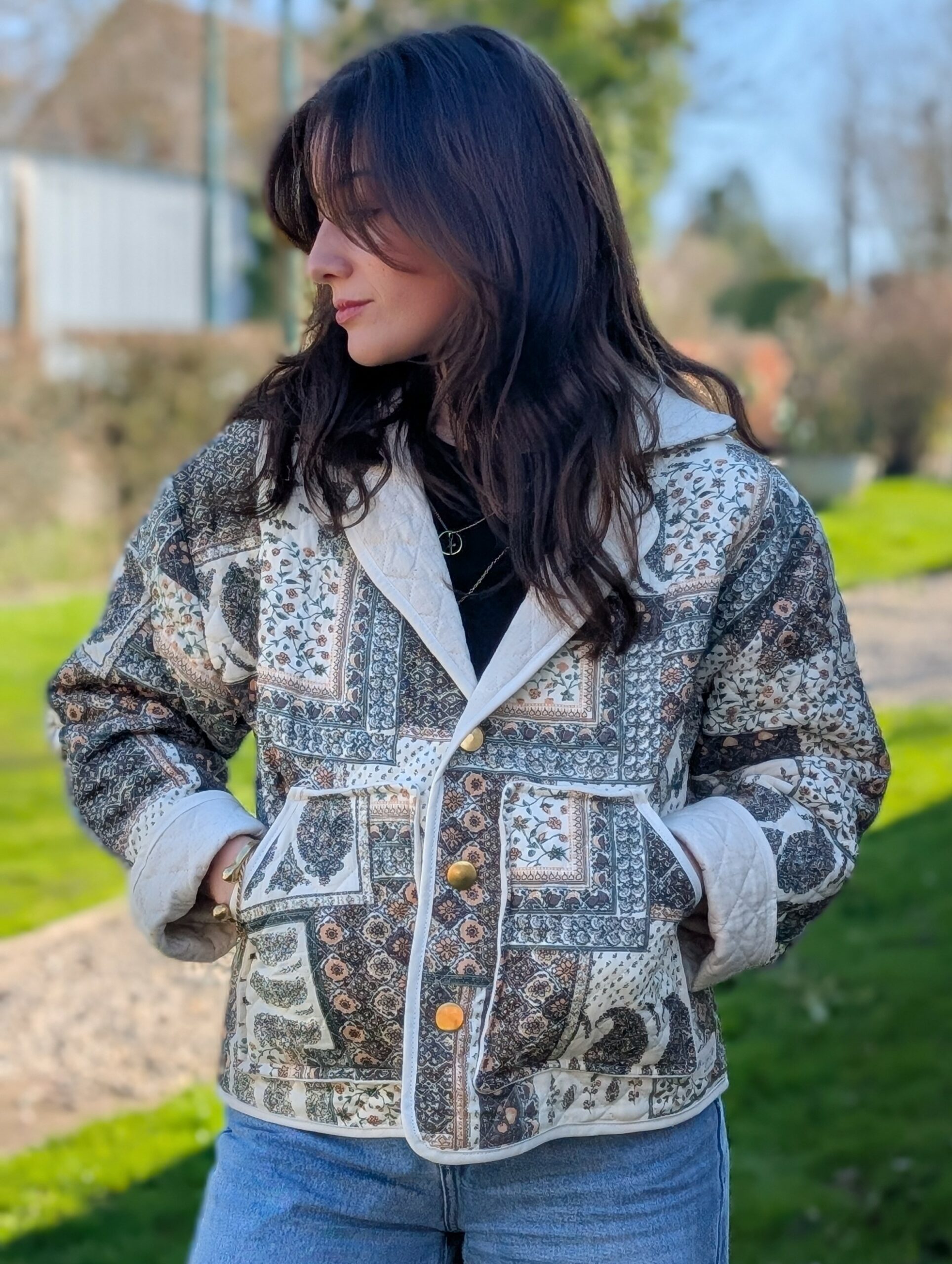Craquez pour cette veste matelassée femme cousue main, une pièce artisanale à la fois confortable, originale et facile à porter. Réalisée dans un tissu matelassé imprimé, elle apporte une touche bohème et élégante à toutes vos tenues.