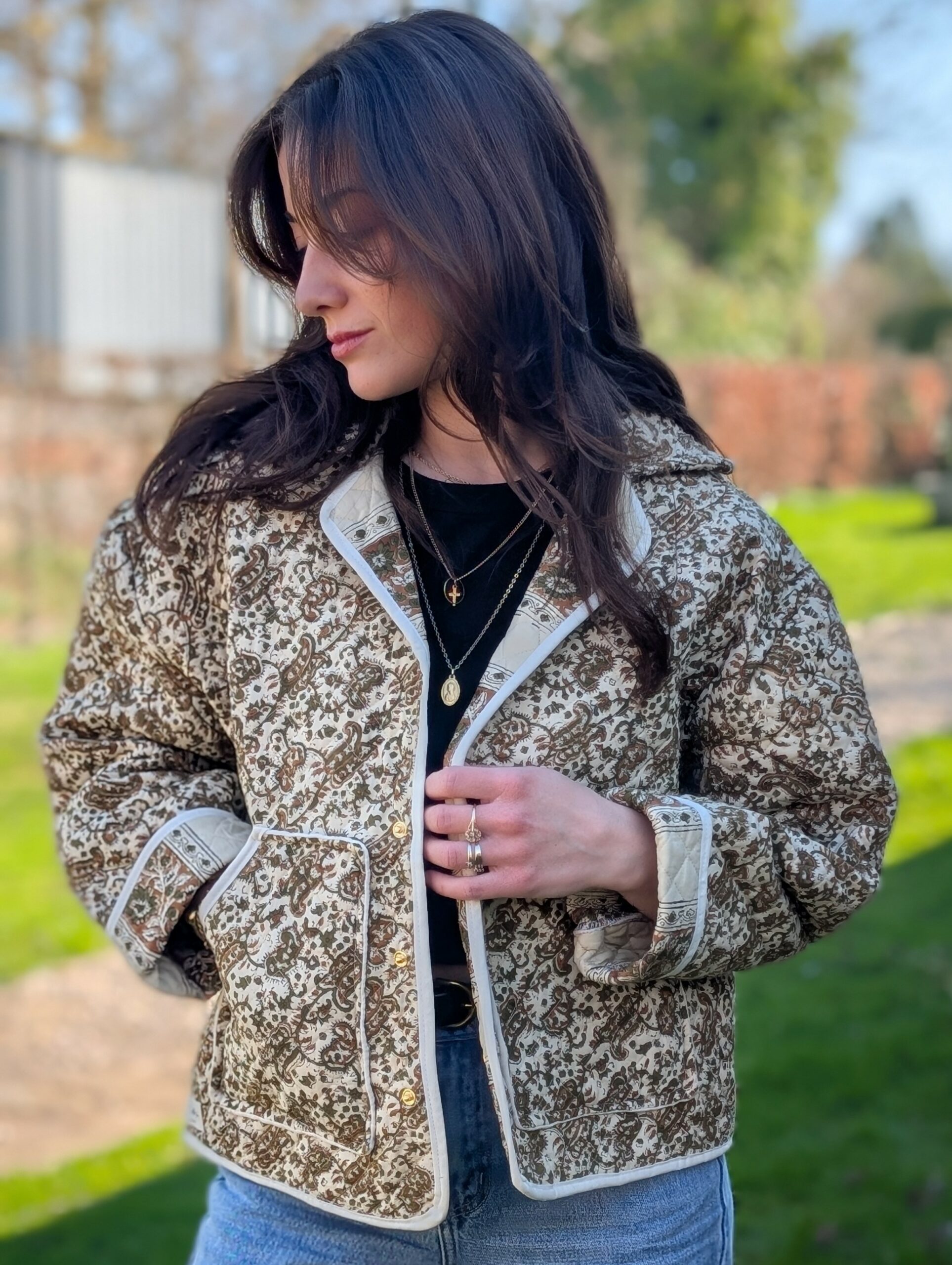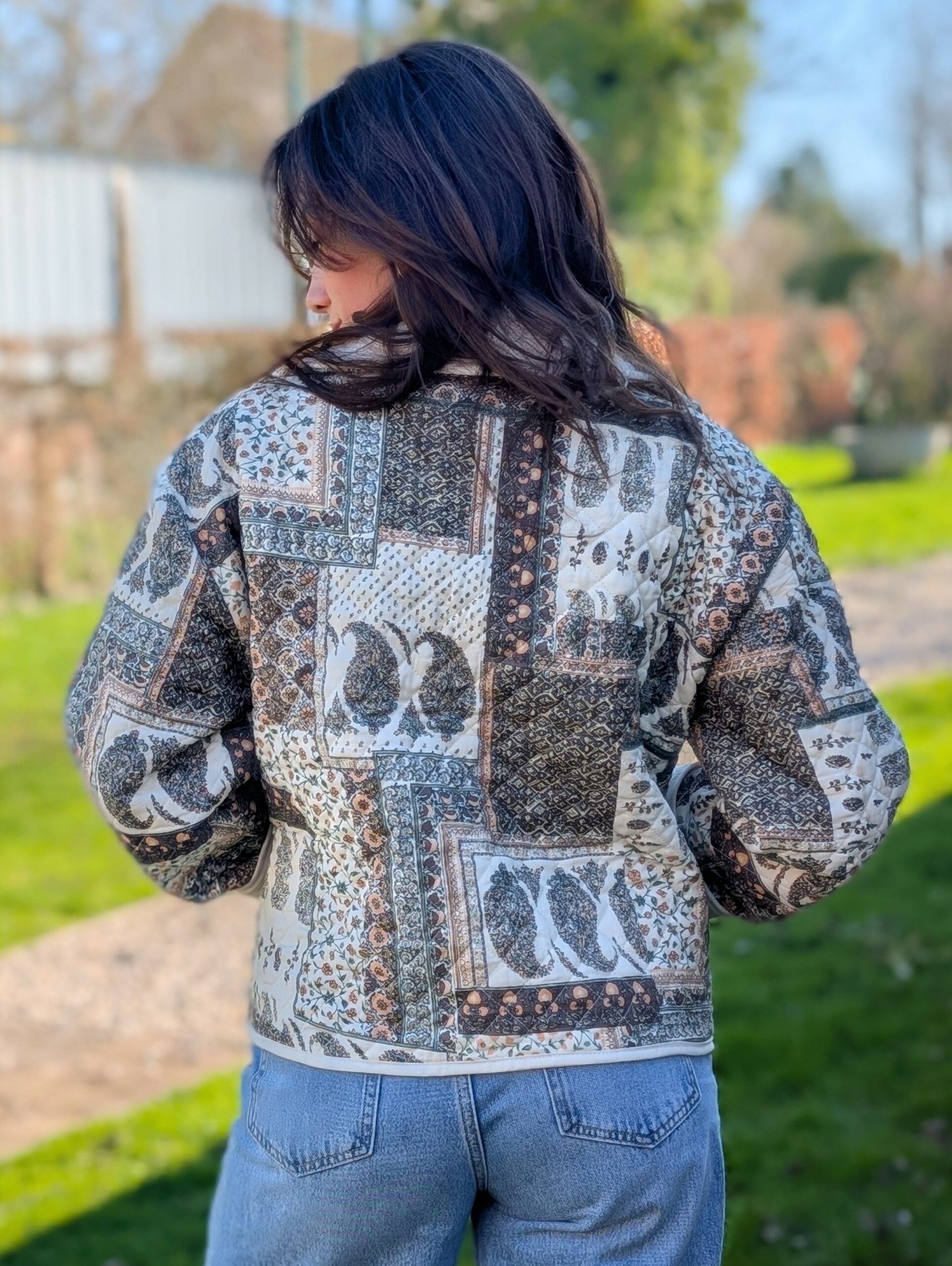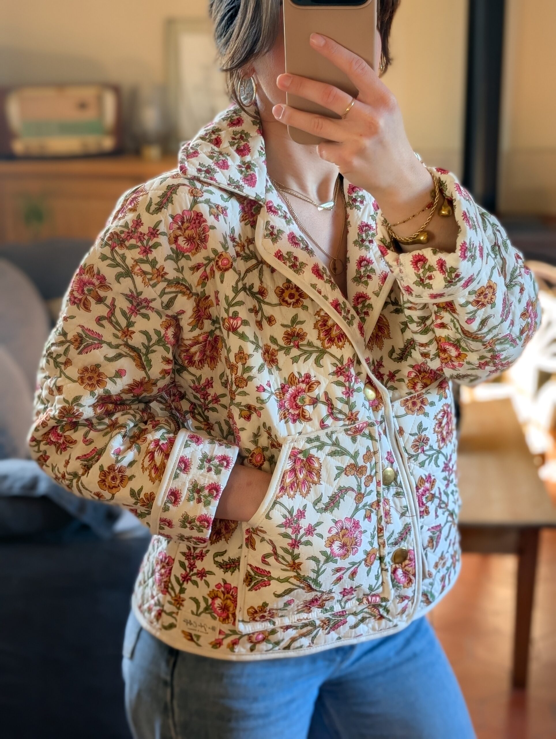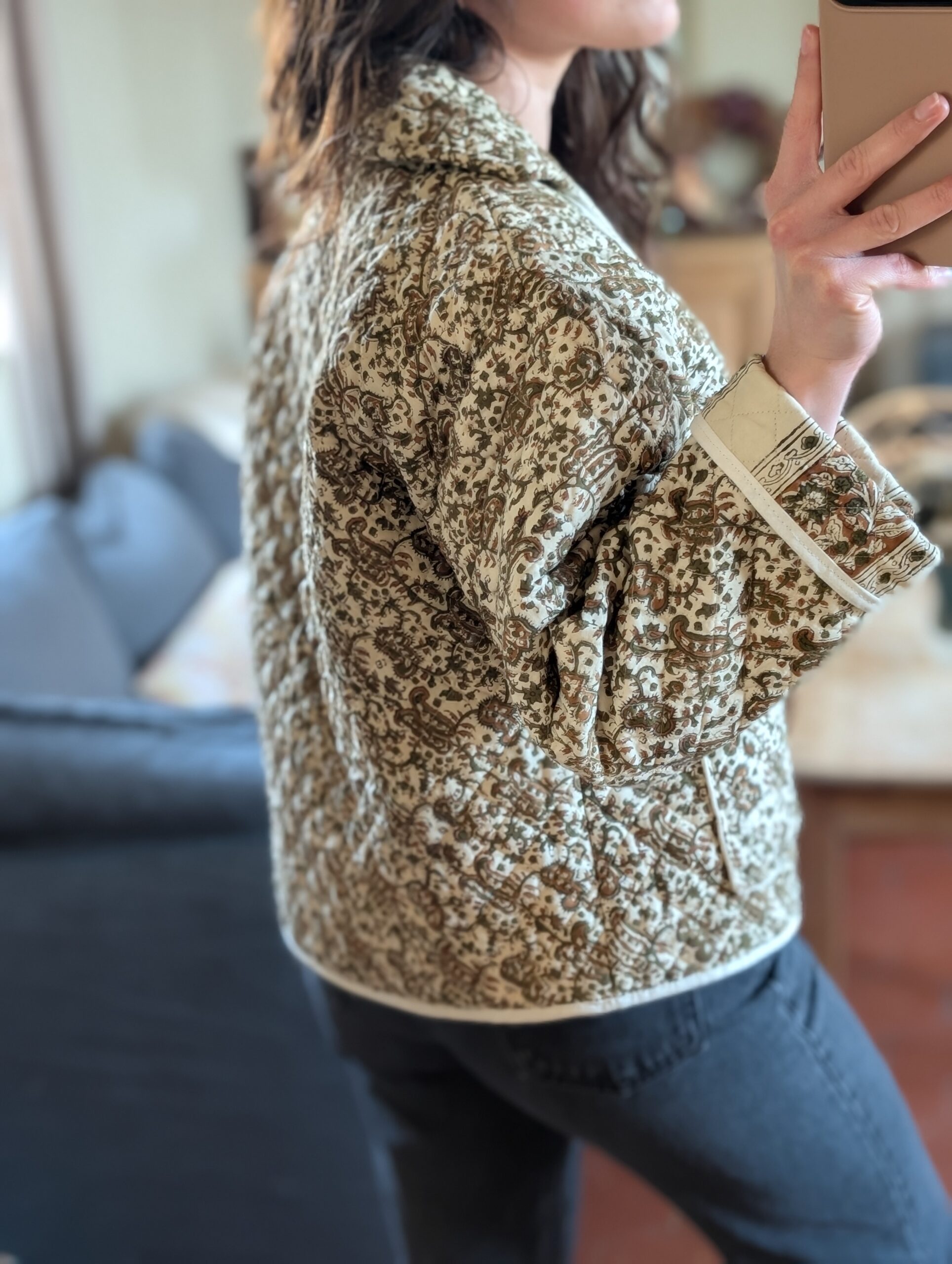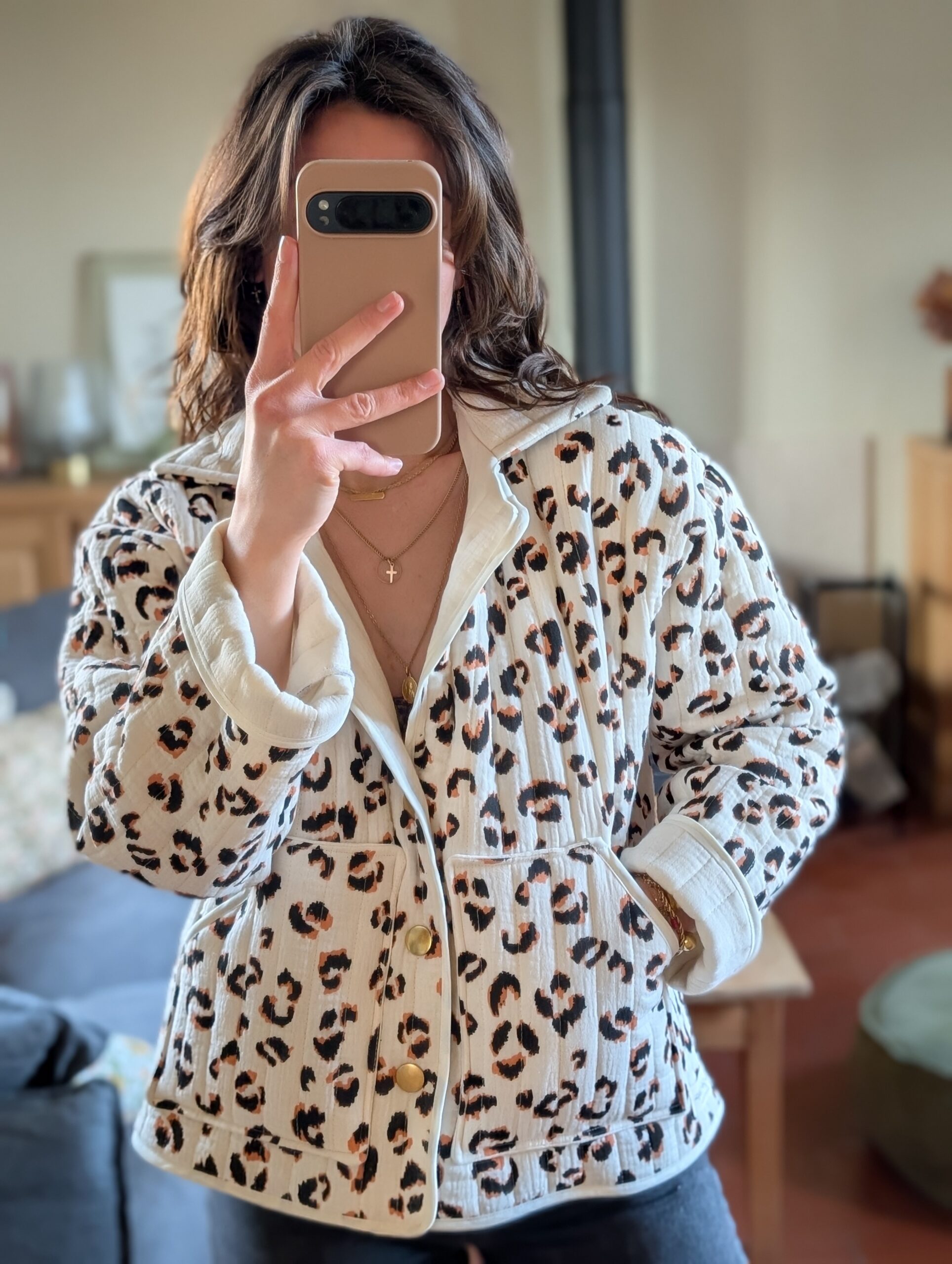 Craquez pour cette veste matelassée femme cousue main, une pièce artisanale à la fois confortable, originale et facile à porter. Réalisée dans un tissu matelassé imprimé, elle apporte une touche bohème et élégante à toutes vos tenues.